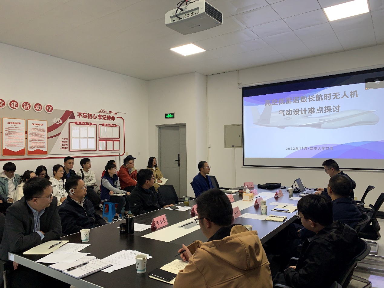 接下来,成飞集团李锐高级工程师为师生们开展了题为“高空低雷诺数长航时无人机气动设计难点探讨”的学术讲座。李锐高级工程师从介绍高空长航时无人机的基本情况切入,循序渐进地讲解了高空低雷诺数长航时无人机的设计理念及其中的关键气动设计难点,包括信息传输与飞行控制、能源和动力问题、高空低雷诺数条件下气动设计问题等。讲座最后,李锐高级工程师与师生们展开了积极地交流互动,同时成飞集团的夏斌等两位高级工程师也与学院老师就技术问题展开了热烈讨论,双方都感受到这是一次很有价值的学术交流。