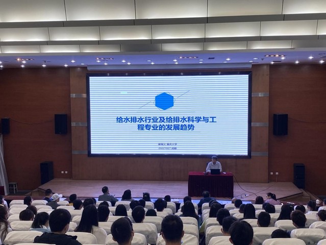 崔福义教授以“给水排水行业及给排水科学与工程专业的发展趋势”为题,生动全面讲述了专业发展历史,分析了专业发展现状,提出了专业人才需求,回答了专业热点问题;同时,他强调给排水专业的学生要树立崇高目标,主动承担历史责任,升华人生价值,以保障人民生命安全、财产安全,优化人民生活环境,提高人民生活质量为己任,注重知识性、科学性、生活性的统一,努力学习、全面发展,为成为满足社会需要的复合型人才而奋斗。