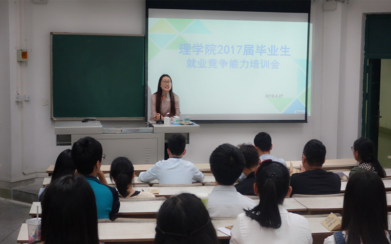 4月27日晚7点,理学院2017届毕业生就业竞争能力培训在3B-301教室举行。学院就业工作联系人王婕为2013级部分专业的同学作了就业专题培训。
