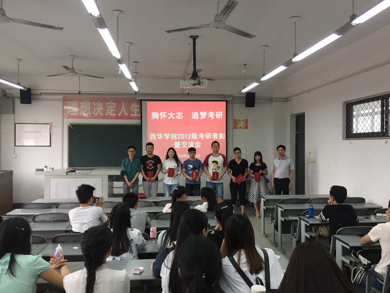 5月12日下午14:00,西华学院2012级考研表彰暨交流会在6C-506专用教室举行。参加本次表彰大会的有学院党总支书记兼副院长何承源教授,学院办公室主任兼团委书记李绍军老师,辅导员李维春老师,西华学院2012级考研优秀学生代表以及学院低年级学生代表。