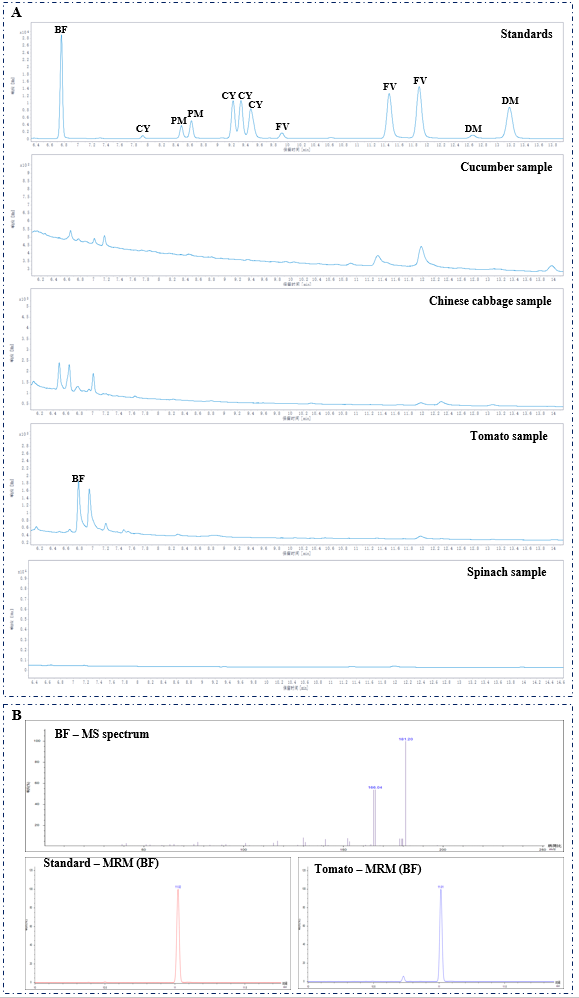 图5.(A)五种拟除虫菊酯类杀虫剂标准溶液,空白黄瓜、卷心菜和菠菜样本,以及受联苯菊酯污染的番茄样本的GC-µECD色谱图;(B)联苯菊酯的全扫描质谱图以及其在标准溶液和番茄样本中的MRM色谱图。