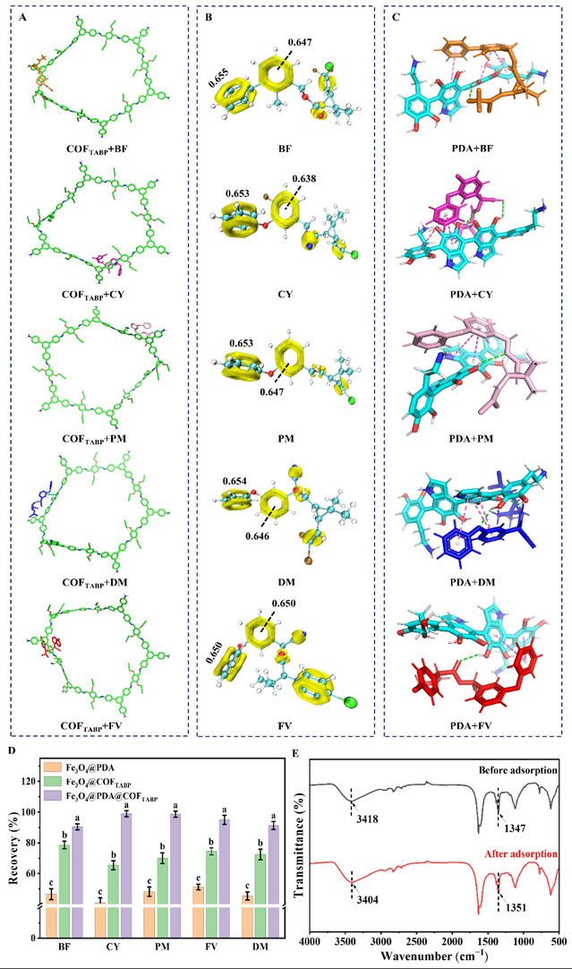 图4. 吸附机制分析:(A)COF重复单元与五种农药的最优分子对接模型;(B)五种农药的LOL-p分析;(C)PDA重复单元与五种农药的最优对接构象;(D)三种不同吸附剂对五种农药的萃取回收率比较;(E)Fe3O4@PDA@COFTABP在吸附农药前后的FT-IR光谱图。