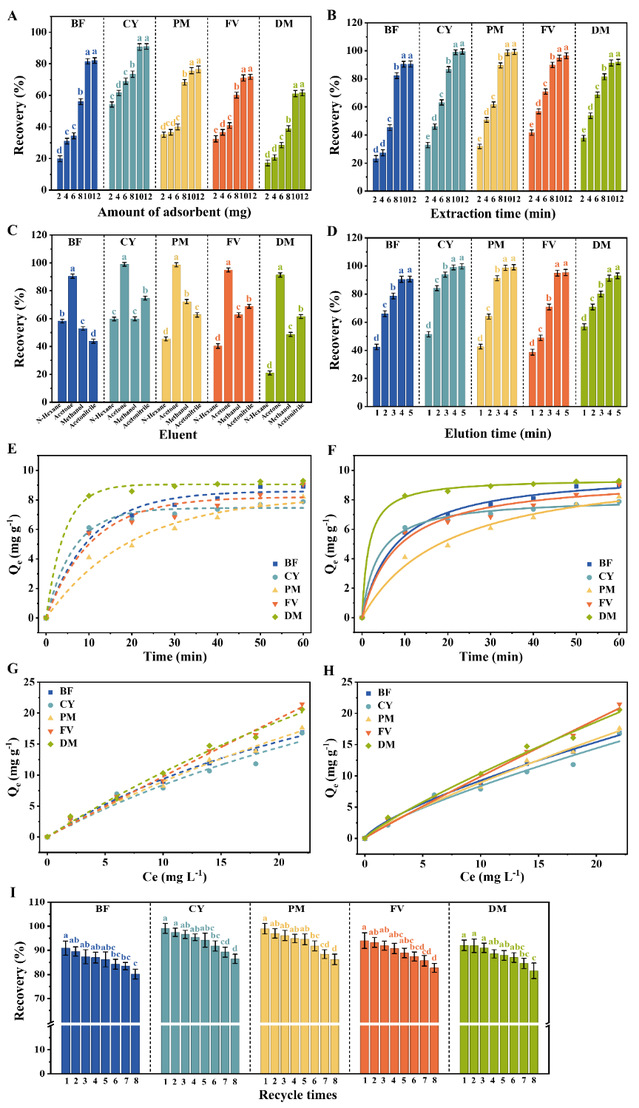 图3.(A)吸附剂用量、(B)萃取时间、(C)洗脱溶剂以及(D)洗脱时间对五种拟除虫菊酯类农药萃取效率的影响;五种农药在Fe3O4@PDA@COFTABP上的吸附动力学拟合:(E)伪一级模型和(F)伪二级模型;五种农药在Fe3O4@PDA@COFTABP上的吸附等温线拟合:(G)Langmuir模型和(H)Freundlich模型;(I)Fe3O4@PDA@COFTABP纳米复合材料的可重复使用性。