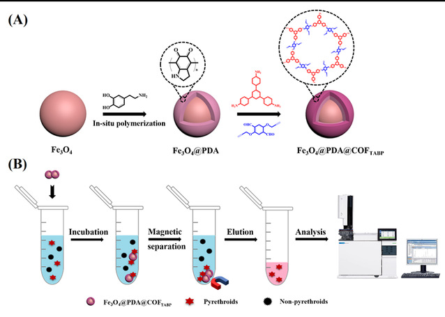 图1. Fe3O4@PDA@COFTABP纳米复合材料的合成策略及其在磁固相萃取中的应用示意图。