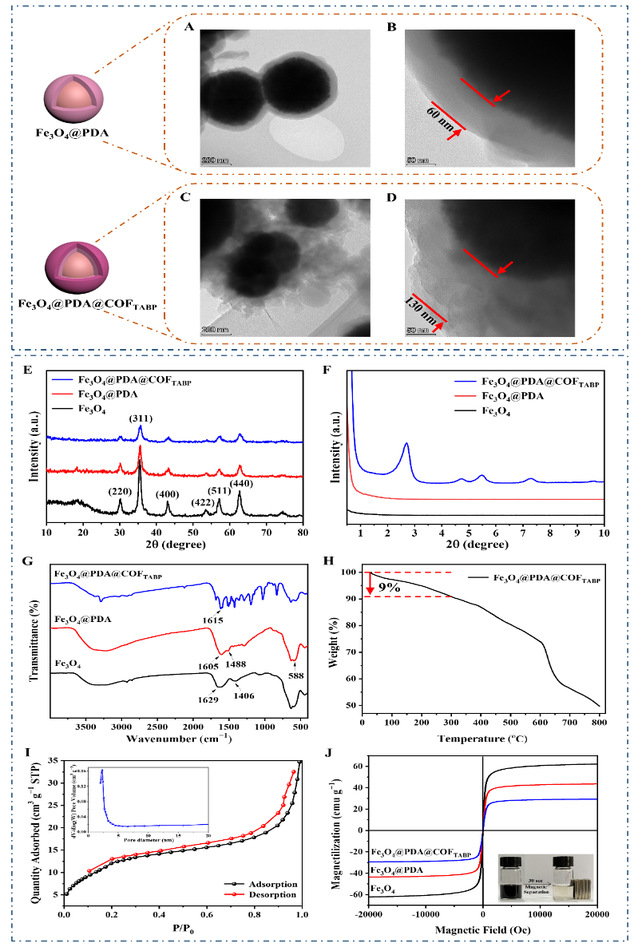 图2. (A、B)Fe3O4@PDA的透射电子显微镜图像,(C、D)Fe3O4@PDA@COFTABP的透射电子显微镜图像;(E)广角X射线衍射图谱,(F)小角X射线衍射图谱,(G)Fe3O4、Fe3O4@PDA和Fe3O4@PDA@COFTABP的傅里叶变换红外光谱图;(H)Fe3O4@PDA@COFTABP的热重分析曲线,(I)N2吸附-脱附等温线;(J)Fe3O4、Fe3O4@PDA和Fe3O4@PDA@COFTABP的磁滞回线。