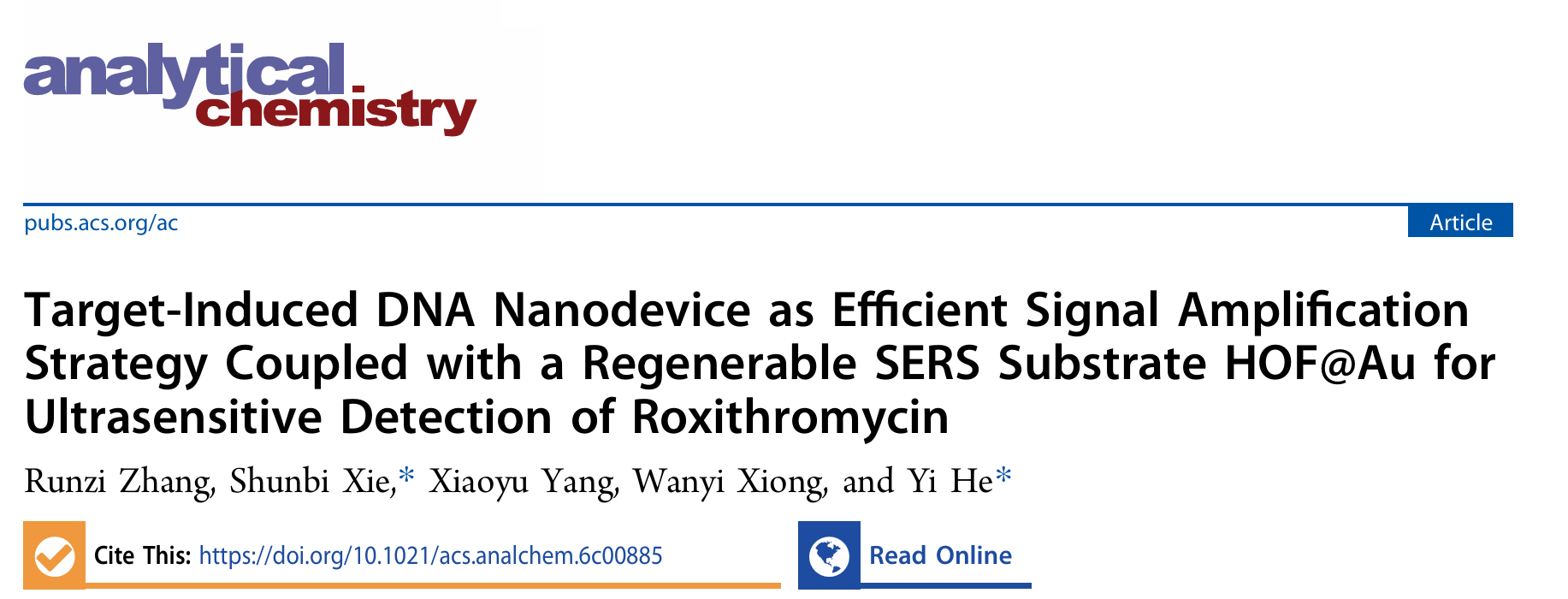 近日,西华大学理学院何毅课题组及合作者在分析化学TOP期刊《Analytical Chemistry》(中科院一区TOP,IF=6.7,自然指数期刊)上发表题为“Target-Induced DNA Nanodevice as Efficient Signal Amplification Strategy Coupled with a Regenerable SERS Substrate HOF@Au for Ultrasensitive Detection of Roxithromycin”的研究论文,何毅为该论文通讯作者,西华大学2023级硕士研究生张润滋为该论文第一作者。