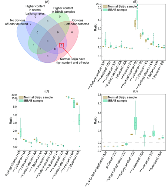 基于化合物含量与风味特征的韦恩分析(A)筛选正常酒中含量偏高的异味化合物。其与四大酯(B)及四大酸(C)的含量比例分析。关键焦苦味化合物与己酸乙酯的含量比例分析(D)。显著性标记:* 0.01 < p < 0.05,** 0.001 < p < 0.01,*** p < 0.001。EH:己酸乙酯,EA:乙酸乙酯,EL:乳酸乙酯,EB:丁酸乙酯,HA:己酸,AA:乙酸,LA:乳酸,BA:丁酸