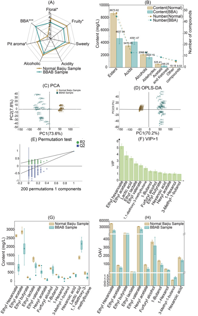 正常白酒与焦苦味白酒的香气轮廓(A)、化合物含量及种类(B)。多元分析(C、D、E)筛选出的VIP>1化合物(F),及其含量(G)及OAV值(H)。显著性标记:* 0.01 < p < 0.05,** 0.001 < p < 0.01,*** p < 0.001