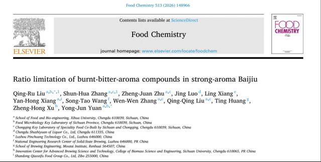 近日,食品与生物工程学院袁永俊教授团队在国际食品Top期刊《Food Chemistry》(一区Top, IF = 10.25)发表题为 “Ratio limitation of burnt-bitter-aroma compounds in strong-aroma Baijiu”的研究性论文。第一作者为食品与生物工程学院刘青茹博士和2023级硕士研究生张顺华,袁永俊教授为通讯作者。本文通过创新的比值逻辑推导方法,解析了浓香型白酒关键焦苦味物质,系统探讨了其与己酸乙酯的比值关系并明确其上限,为浓香型白酒焦苦味控制与酒体勾调奠定理论基础。