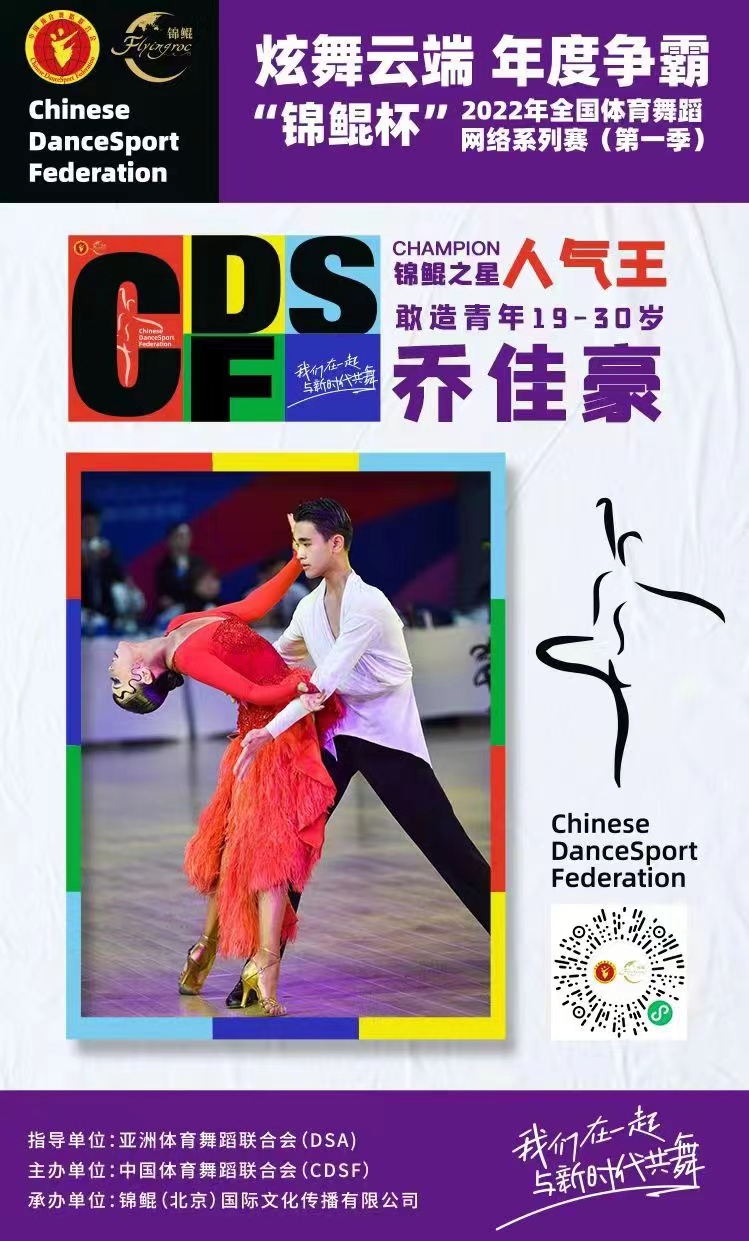 2022年全国体育舞蹈网络系列赛由亚洲体育舞蹈联合会(DSA)指导,中国体育舞蹈联合会(CDSF)主办,是国内体育舞蹈领域内最具影响力的赛事之一。据悉,本次比赛共有133支队伍、4000余名选手参加。我校乔佳豪同学在众多选手中脱颖而出,获得“锦鲲之星人气王”称号,并受邀参加赛事主题曲MV及“冠军故事”纪录片录制,作为特邀嘉宾参加腾讯视频《意气风发的少年》第二季节目录制,受邀做客参与第二季赛事直播间。