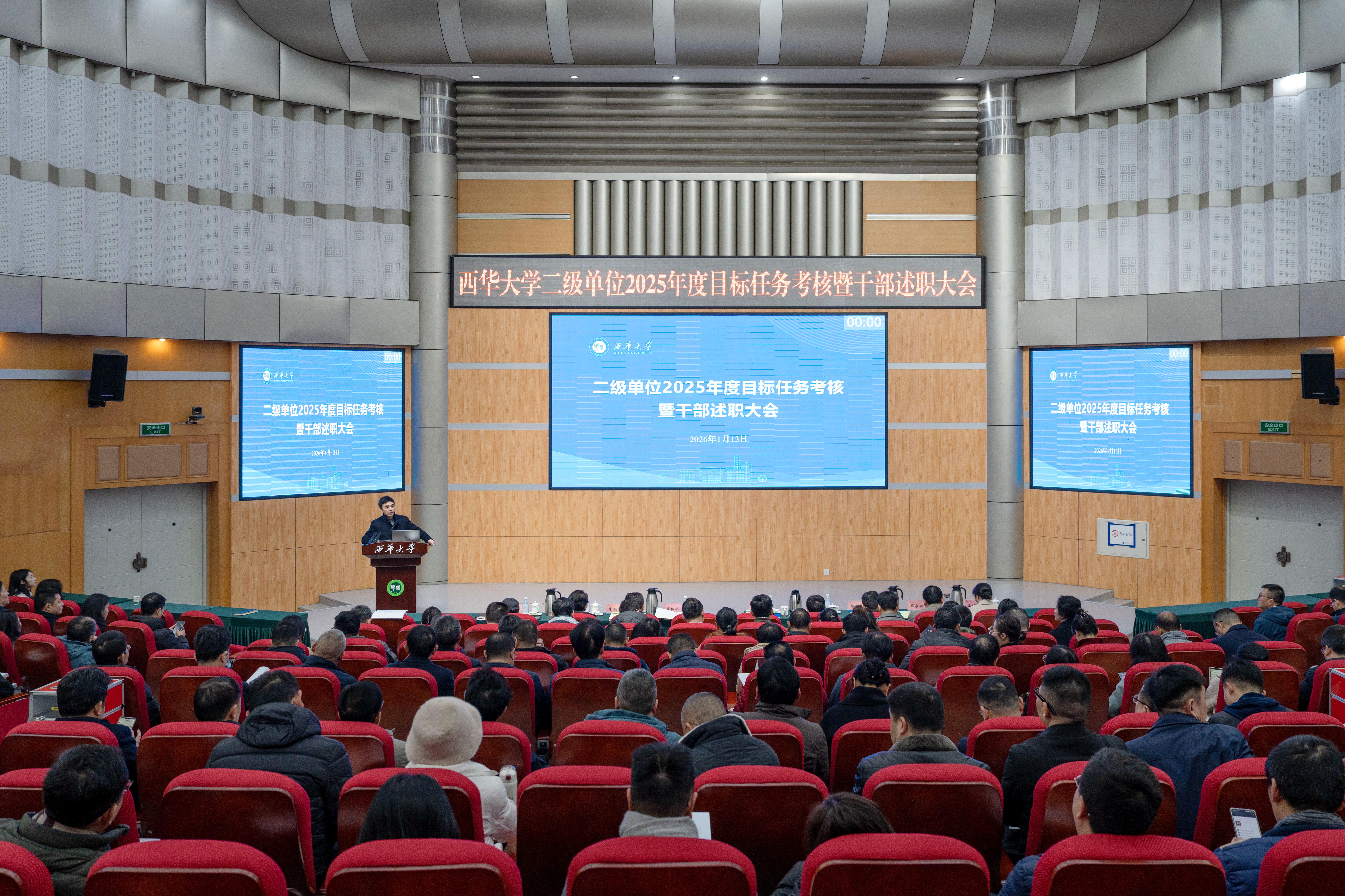 1月13日,西华大学二级单位2025年度目标任务考核暨干部述职大会在四教报告厅召开。