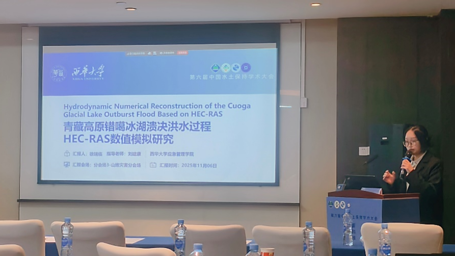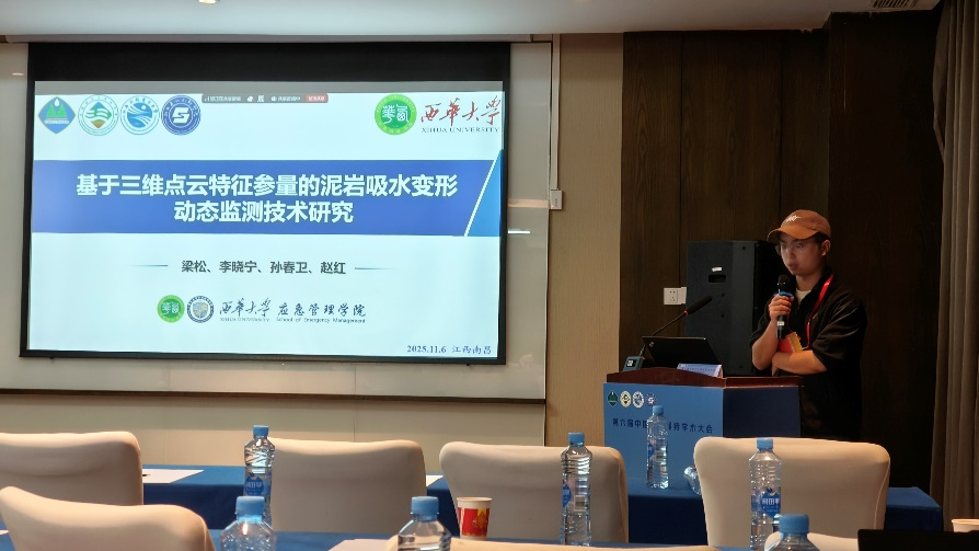 会议期间,刘建康副教授作为中国水土保持学会滑坡泥石流防治专业委员会委员参加专委会年度工作会议,并主持大会“山地灾害”分会场专题汇报环节。学院研究生徐瑞临在分会场上作了题为《青藏高原错噶冰湖溃决洪水过程HEC-RAS数值模拟研究》的汇报,结合多源数据分析冰湖溃决形成机制,并采用数值模拟手段对错噶冰湖溃决过程进行重构与验证;研究生梁松分享了《基于三维点云特征参量的泥岩吸水变形动态监测技术》,系统介绍团队研发的半球视场三维动态监测系统,展示了基于时序三维点云特征参量的泥岩变形分析方法与结果。