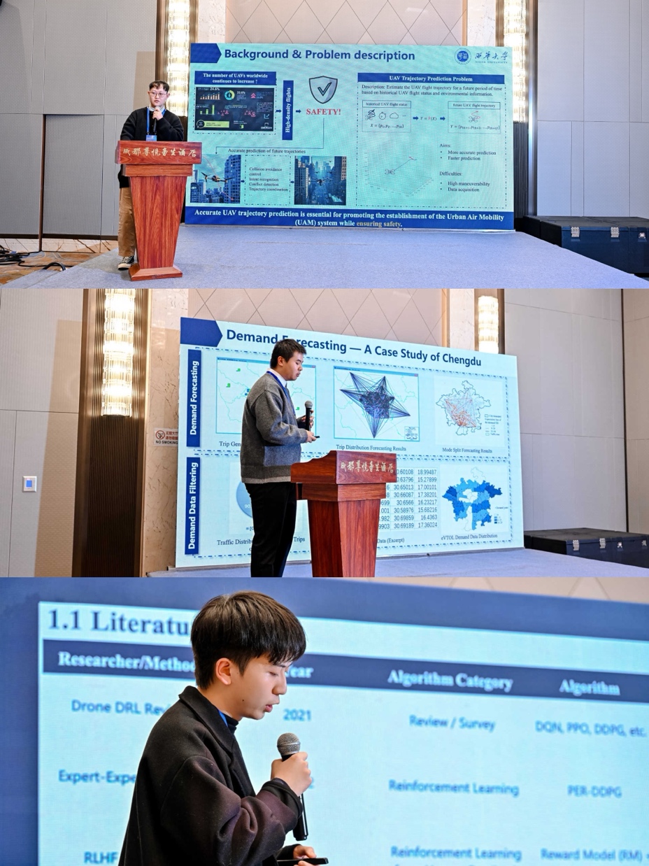 为促进更广泛的学术交流,大会还设置了多个平行分论坛,主题涵盖航空运营管理、航空运输与安全、航空经济学、绿色航空、低空经济和技术等热点方向。汽车与交通学院研究生郭笑非、岳川翔、蒲科先分别在论坛上汇报了最新研究成果,展现出青年学子的科研活力。