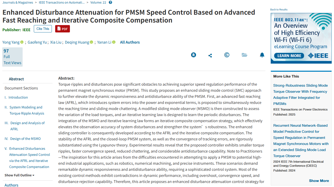 面向永磁同步电机在机器人、精密仪器和数控加工等高端装备领域的需求,团队在《IEEE Transactions on Automation Science and Engineering》(中科院JCR 2区)发表题为“Enhanced Disturbance Attenuation for PMSM Speed Control Based on Advanced Fast Reaching and Iterative Composite Compensation”的研究论文。针对电机转矩脉动与负载扰动等问题,提出了一种基于先进快速趋近律与迭代复合补偿的永磁同步电机增强抗扰调速方法,利用迭代学习和滑模观测器方法有效提高了负载扰动观测精度与系统鲁棒性。IEEE T-ASE为IEEE旗下的自动化科学与工程领域的顶级期刊。涵盖了自动化领域的各个方面,包括自动化理论、方法与算法、自动化系统与工程、人工智能在自动化中的应用、生物医学自动化等。