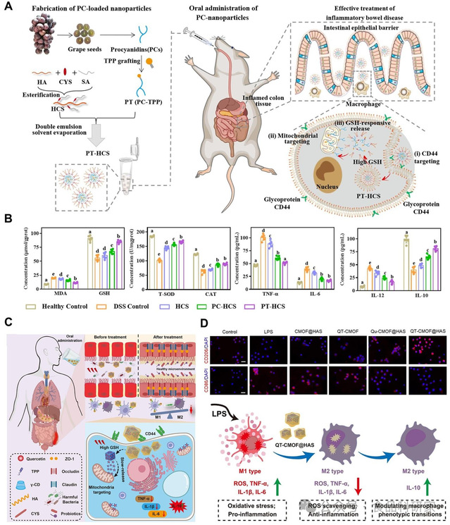(A)原花青素(PCs)口服递送系统的构建示意图:将原花青素与线粒体靶向三苯基膦(TPP)衍生物偶联,并包覆透明质酸(HA)外壳(Tie et al., 2022);(B)结肠炎小鼠结肠组织中氧化应激相关指标及炎症细胞因子的水平(Tie et al., 2022);(C)槲皮素(Qt)-CMOF@HAS 纳米立方体的调控机制示意图(Zhao, Chen, et al., 2025);(D)Qt-CMOF@HAS 纳米立方体的抗氧化应激和抗炎能力(Zhao, Chen, et al., 2025)