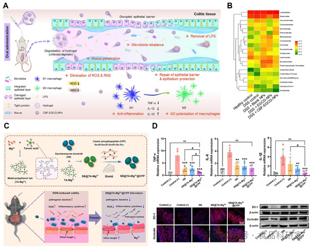 (A)口服抗菌肽 - EGCG 纳米药物协同治疗 UC 的示意图(Liu, Chen, et al., 2022);(B)CBF-EGCG-NPs 调控肠道菌群的效果(Liu, Cao, et al., 2022);(C)SB@TA-Mg²⁺@CPP 的制备及其预防 UC 的多功能机制示意图(Qian et al., 2025);(D)摄入 SB@TA-Mg²⁺@CPP 对肠道屏障改善的作用(Qian et al., 2025)
