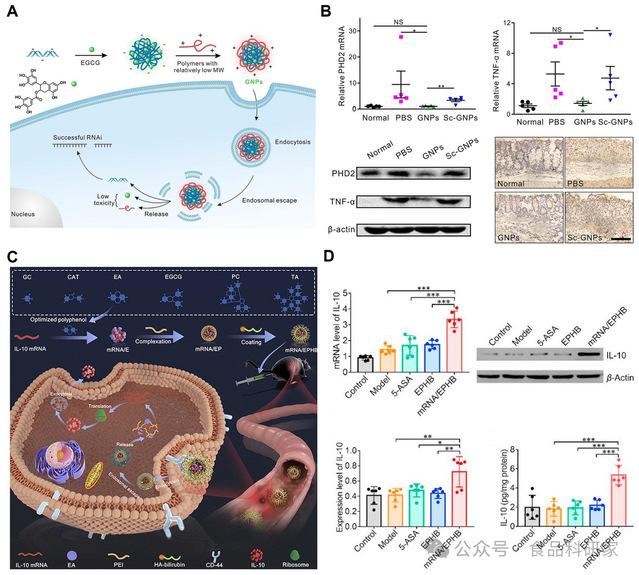 (A)绿色纳米颗粒(GNPs)的制备及其基因沉默机制示意图(Shen et al., 2018);(B)GNPs 在 DSS 诱导的肠道损伤模型中的治疗效果(Shen et al., 2018);(C)以多酚化合物为功能成分的 IL-10 mRNA 递送平台示意图(Chen, Hao, et al.,2022);(D)该递送平台在急性 UC 模型中的疗效评估(Chen, Hao, et al., 2022)