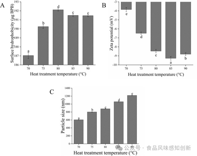 不同热处理温度猪肉MPs表面疏水性(A)、zeta电位(B)和粒径分布(C)变化。不同字母表示在不同热处理温度下存在显著差异(Duncan检验,p<0.05)。