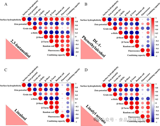 猪肉MPs的空间构象参数及其对2,3-丁二醇(A)、DL-1-苯乙醇(B)、芳樟醇(C)和乙酸芳樟酯(D)结合能力的相关性分析热图。符号(*)表示0.05水平的显著相关性。