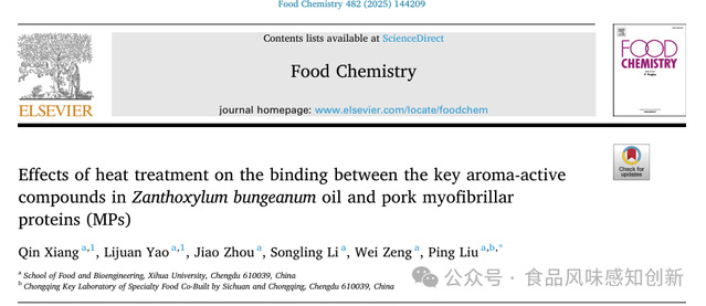 近日,食品与生物工程学院向琴老师在《Food Chemistry》发表题为“Effects of heat treatment on the binding between the key aroma-active compounds in Zanthoxylum bungeanum oil and pork myofibrillar proteins (MPs).”的研究性论文。食品与生物工程学院向琴老师和研究生姚丽娟同为第一作者,通讯作者为食品与生物工程学院刘平教授。该研究得到了重庆市科学技术委员会资助。