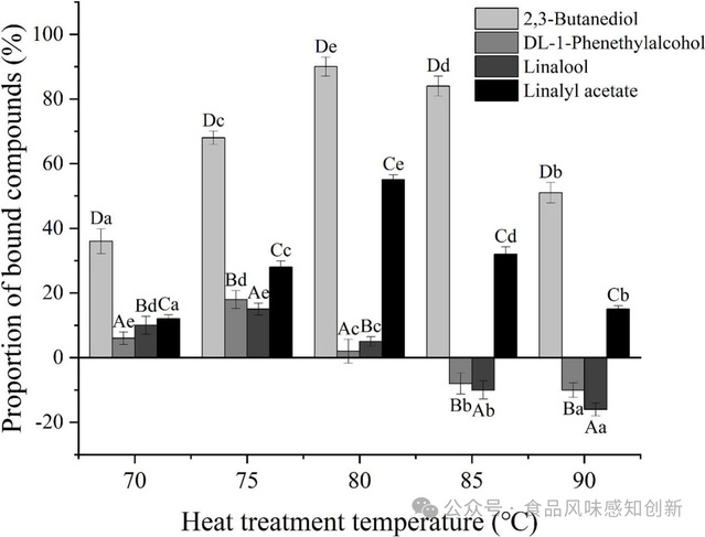 猪肉MPs和香气化合物在不同热处理温度下的结合比例。不同的大写字母(A-D)表示相同温度不同香气化合物之间差异显著,不同的小写字母(a-d)表示相同香气化合物不同温度之间差异显著(Duncan test,p<0.05)。