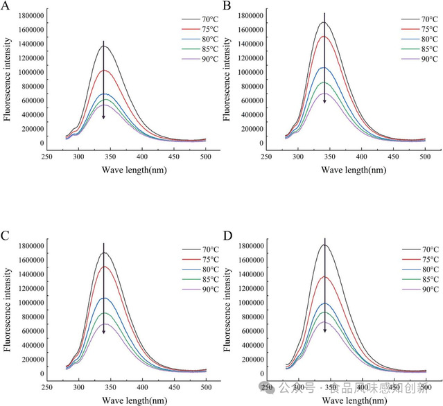 热处理温度对1mg/mLMPs荧光强度的影响:2,3-丁二醇(A)、DL-1-苯乙醇(B)、芳樟醇(C)和乙酸芳樟酯(D)。