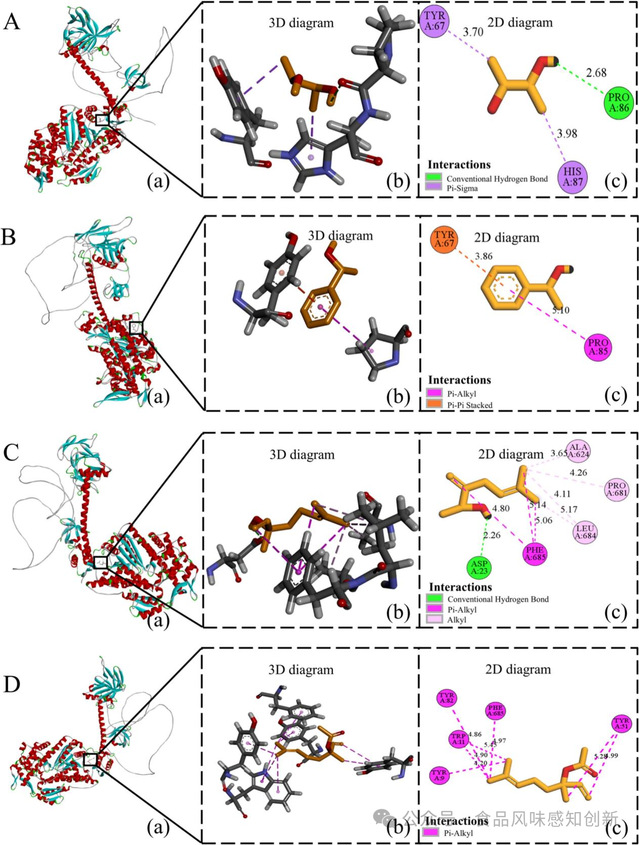 猪肉MPs与花椒油芳香活性化合物相互作用的3D图,包括2,3-丁二醇(A)、DL-1-苯乙醇(B)、芳樟醇(C)和乙酸芳樟酯(D)。图a、b和c分别表示他们的最佳模型、最佳3D图和最佳2D图。