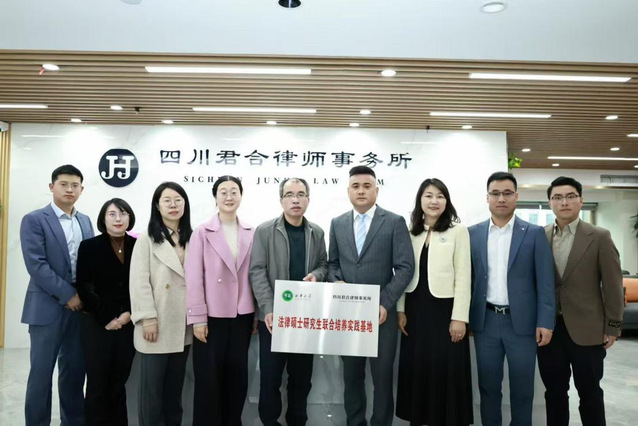 为深化产教融合、校企协同育人,精准对接法律实务领域人才需求,拓宽法律硕士研究生实践与就业渠道,2026年3月12日上午,西华大学法学院张邦铺院长、王黎黎副院长、王娜博士一行前往四川君合律师事务所(以下简称“君合所”)开展访企拓岗专项行动,并举行“法律硕士研究生联合培养实践基地”签约授牌仪式。君合所执行主任黄明建,刘艳副主任,高级合伙人李力律师、褚立宁律师以及西华大学法学专业校友、君合所青年律师代表杨双瑜律师、朱林律师出席会议。