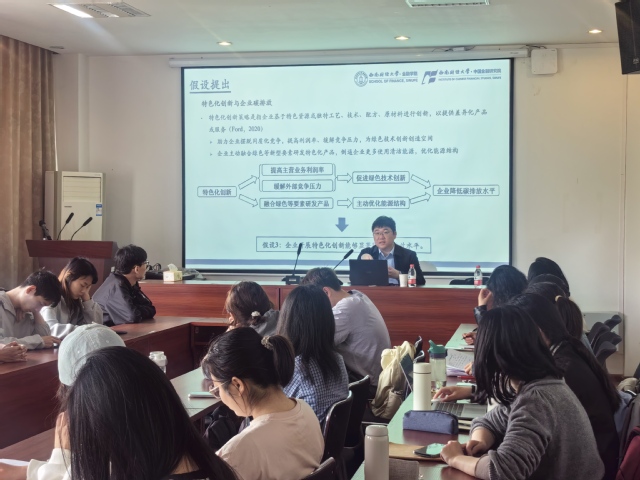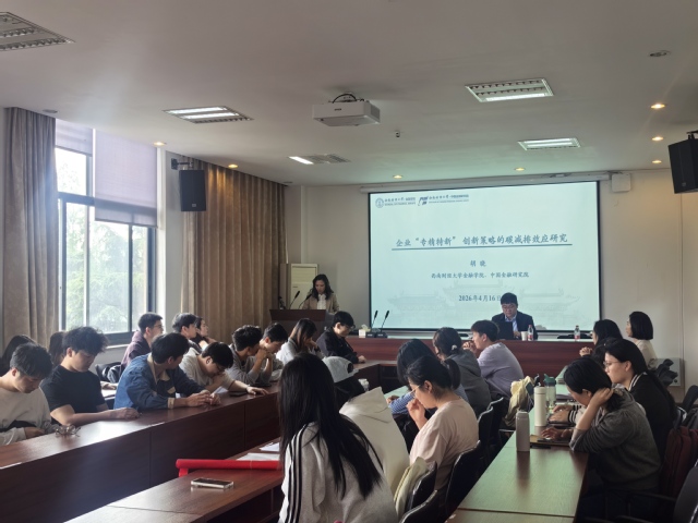 程盈莹院长首先介绍胡晓教授学术背景与研究成果,指出本次讲座紧扣“双碳”战略与“专精特新”企业培育方向,契合科研大讨论要求,对学院凝练科研特色、提升科研水平具有重要意义。接着胡晓教授系统阐释研究背景与核心价值,围绕专业化、精细化、特色化、新颖化四类创新路径,完整呈现研究框架、实证设计与主要结论。研究表明,专业化、精细化、特色化创新可显著推动企业碳减排,新颖化创新效应存在异质性。讲座结合案例与政策实践,展示规范严谨的实证研究范式,为师生开展相关研究提供清晰指引。金融投资系主任王蕊在总结中表示,讲座主题前沿、内容扎实,有效深化了师生对企业创新与绿色转型的认识,为学院相关领域科研工作提供新思路、新方法。