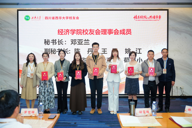 会上,西华大学校友工作处处长罗世韡宣读了《关于四川省西华大学校友会经济学院校友分会成立及第一届理事会成员组成的通知》,标志着经济学院校友工作正式迈入规范化、组织化发展的新阶段。随后,校友工作处副处长高华为经济学院校友会首任会长杨常春授予会旗、会牌。红色会旗与精致会牌承载着使命与责任,象征着经济学院校友工作开启崭新篇章。党委书记胡雪峰与院长程盈莹共同为新当选的校友会理事会成员颁发聘书,理事会核心团队正式组建。